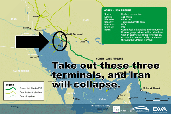 All Israel needs to do to destroy Iran's ability to project power out into the Middle East is destroy just three oil terminals as they attack Iranian nuclear facilities. In fact, destroying those three terminals will eliminate Iran's ability to continue their nuclear program for many years.